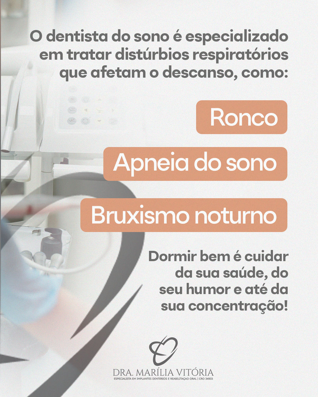 Eu, como dentista do sono, atuo no diagnóstico e tratamento de problemas como apneia do sono, bruxismo noturno e ronco, utilizando tecnologias que ajudam a restaurar a qualidade do descanso e o bem-estar no dia a dia de meus pacientes.